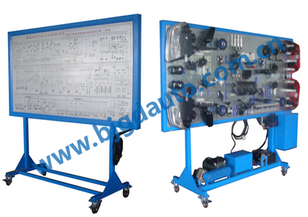 設(shè)備采用原車電器電控系統(tǒng)器件組成,包括:發(fā)動機(jī)電控系統(tǒng)、電源系統(tǒng)、起動系統(tǒng)、照明系統(tǒng)、儀表系統(tǒng)、信號系統(tǒng)、音響系統(tǒng)、玻璃清潔系統(tǒng)、中控門鎖、玻璃升降器、電動后視鏡、汽車?yán)群托铍姵氐?。外加系統(tǒng)主要包括: 故障設(shè)置系統(tǒng)、故障顯示裝置、驅(qū)動電機(jī)、電源總開關(guān)、檢測端子以及安全防護(hù)裝置等。本臺架可以完整展示汽車電器電控系統(tǒng)的組成、結(jié)構(gòu)和工作原理,可以進(jìn)行電器電控系統(tǒng)常見故障的模擬、診斷和檢測實(shí)操訓(xùn)練,提高學(xué)生分析和解決實(shí)際問題的能力,適合中高等汽車院校與培訓(xùn)機(jī)構(gòu)對學(xué)員進(jìn)行汽車電器電控系統(tǒng)的教學(xué)需要。