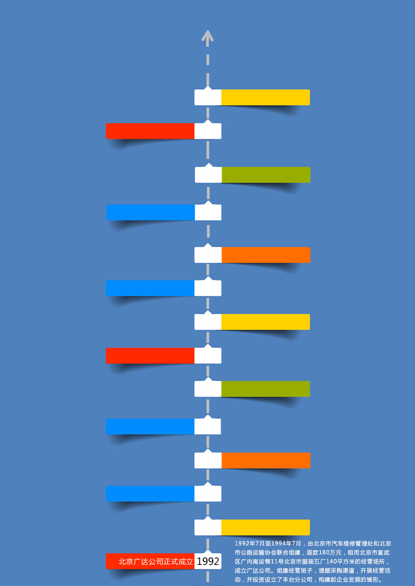 1992年7月至1994年7月,由北京市汽車維修管理處和北京市公路運(yùn)輸協(xié)會聯(lián)合組建,撥款180萬元,租用北京市宣武區(qū)廣內(nèi)南運(yùn)巷11號北京市服裝五廠140平方米的經(jīng)營場所,成立廣達(dá)公司。組建經(jīng)營班子,理順采購渠道,開展經(jīng)營活動,并投資設(shè)立了豐臺分公司,構(gòu)建起企業(yè)發(fā)展的雛形。